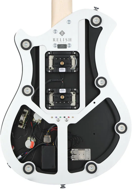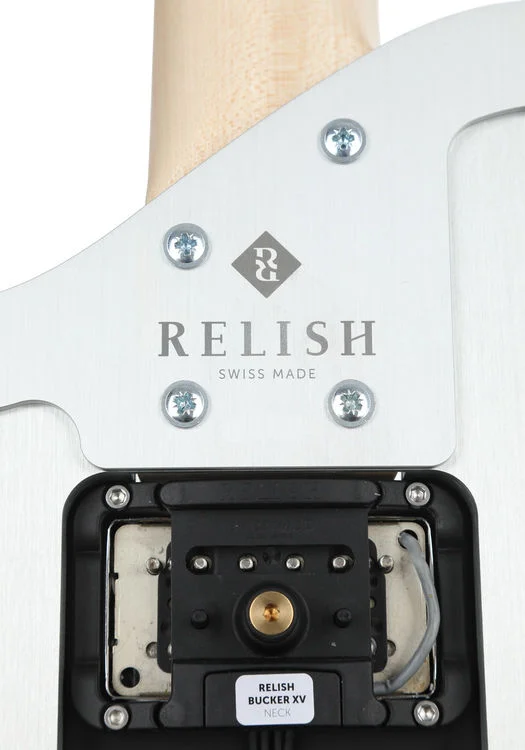 Innovative body designEvery detail of Mary One’s construction was painstakingly engineered by Relish to give players a completely new playing experience. It all starts with a thin semi-hollowbody construction that Relish dubbed the “Floating Sandwich.” It consists of an aluminum core with an alder/ash laminate for the top and back. The top is permanently attached, while the back is securely held in place by a group of magnets. Rubber rings isolate the back panel, allowing the string-through aluminum core to vibrate as freely as possible. By using aluminum, Relish gave the Mary One a completely unique character. It’s bright and powerful with seriously long sustain. And, to top it all off, it feels just like a regular axe when you pick it up to play. ![]() ![]() Climate-resistant tonewoodsIf you live in a harsh climate or hop between deserts and rainforests with regularity, then you know that the weather can take a toll on your favorite guitar. Luckily, the Mary One was designed to solve this problem. Its tonewoods were chosen specifically for their resistance to changes in temperature and humidity. The HPL (High Pressure Laminate) top and back will remain unaffected by climate, refusing to warp even under the most demanding circumstances. The maple neck is topped with a woven bamboo fingerboard. Woven bamboo is more durable than ebony or rosewood and doesn’t shrink or swell at the same rate. This means that you can throw Mary One into the van in New Orleans and drive to your next show in Vegas without worrying about sudden fret sprout. All you need to do is adjust the truss rod to keep the neck playing just the way you like it. It is important to remember that the Mary One is made from natural materials. By taking proper care of your instrument, you can help ensure its longevity in any climate. By choosing the Relish Mary One, you can have a resilient guitar that sounds good, plays perfectly, and looks great doing it. Bent maple neck reduces the risk of headstock breaksThe Mary One is equipped with a neck that’s unlike almost any other neck on the market. Made from a single piece of quartersawn maple, the neck features a bent headstock to provide the optimal string angle without compromising the strength of the neck. To prove how strong their necks are, Relish sent a replacement neck to Sweetwater’s product testing team and challenged them to find a way to break it. Many people took turns standing on the neck, but none managed to deal any damage. While we don’t recommend that you stand on your brand-new Relish, we feel confident that this guitar can stand up to whatever punishment you put it through. ![]() ![]() Patented pickup swapping systemRelish uses a patented pickup swapping system that enables you to drastically alter your axe’s voice in a few seconds. Each pickup is completely removable and requires no specialized tools to do so. But how does this innovative technology work? Each pickup has plated contacts that transfer your signal without the need for soldering. The pickup is held in place by a pair of strong magnets located in the mounting hardware. And the Relish pickup swapping system is completely modular, which opens the door for some serious experimental potential. Need a P-90 in the neck and a ripping humbucker in the bridge? You’ve got it. Want a single-coil in the bridge and a PAF in the neck? You’re covered. Relish offers a variety of pickups to suit the needs of any guitar player, including single-coils, P-90s, and PAFs. They also offer a selection of pickups from other manufacturers, including Bare Knuckle and Seymour Duncan. And, for the ultimate in convenience, you’ll find every set of Relish-compatible pickups right here at Sweetwater. Let Sweetwater make you a custom pickup setDreaming of all the possibilities that a Relish guitar offers? Sweetwater can make it happen! We’re the only Relish-authorized retailer that can mount pickups to fit Relish guitars. This means that you can custom-order an arsenal of your favorite pickups to use with your Relish guitar. Instead of lugging five guitars to your shows, you can buy more pickup sets and travel with a variety of hot-swappable tones in a single guitar case. As long as your favorite pickups are the size of a standard humbucker, our professional guitar techs can mount them for you! Be sure to call your Sweetwater Sales Engineer for more information, as some pickups — such as single-coils — are not currently available with this kit. Note: Empty pickup mounting kits cannot be sold separately, as an unauthorized installation will void the kit’s warranty. ![]() ![]() Simplified switching configurationPlayers who love tonal variety but want simple controls will love the Mary One. This guitar comes loaded with a pair of Relish XV humbuckers and a Graph Tech Ghost piezo bridge. It has a master volume, a master tone, a 3-way pickup switch, a piezo volume, and a 3-way output toggle that provide tone-shaping abilities. First, the piezo volume control has a push-pull pot that enables a midrange boost. The 3-way output toggle (magnetic pickups only, piezo only, magnetic/piezo blend) enables you to keep your volume controls constant no matter what configuration you’re using. Integrated piezo systemMary One has a few more tones hidden inside its semi-hollow body. It’s loaded with a Graph Tech Ghost piezo system located in the bridge. This allows Mary One to create realistic acoustic tones. The piezo system has a dedicated volume knob that allows you to blend the signal with your electric pickups. For further tonal variation, the piezo’s volume control is equipped with a push-pull pot that engages a mid boost. To handle any application, this guitar has a stereo output that splits the piezo and magnetic pickup signals, so you can route them to different amps in your setup. Give your Sales Engineer a call to grab a specialized stereo guitar cable. ![]() ![]() World-famous Swiss craftsmanshipWhethe