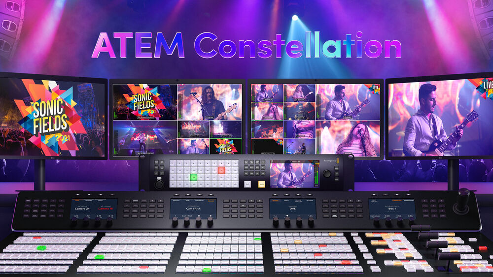 The ATEM Constellation features a built-in Fairlight audio mixer that makes it possible to do extremely complex live sound mixing. The internal mixer supports up to 156 channels. Eighty mixer channels are de-embedded from the SDI inputs, and each input channel features a high-quality 6-band parametric EQ and compressor, limiter, expander, and noise gate, as well as full panning. Extra channels for the analog input, talkback microphone, and media players are supported as well, and the audio mixing features can be controlled via the ATEM Software Control, a Mackie-compatible panel, or Fairlight Audio Console.