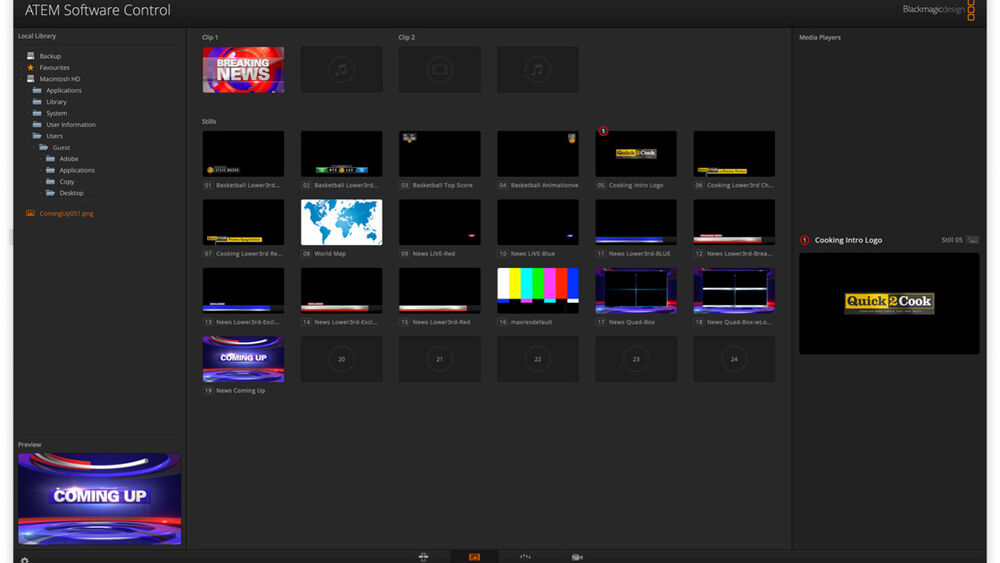The built-in media pool stores broadcast-quality RGBA graphics and animations that can be played back instantly by the two media players. The media pool can hold up to 24 full-resolution 8K stills, or 64 Ultra HD or HD stills. Motion graphics clips for use in animations and stingers can be up to 100 8K RGBA frames, 400 frames in Ultra HD, or 1600 frames in 1080 HD.